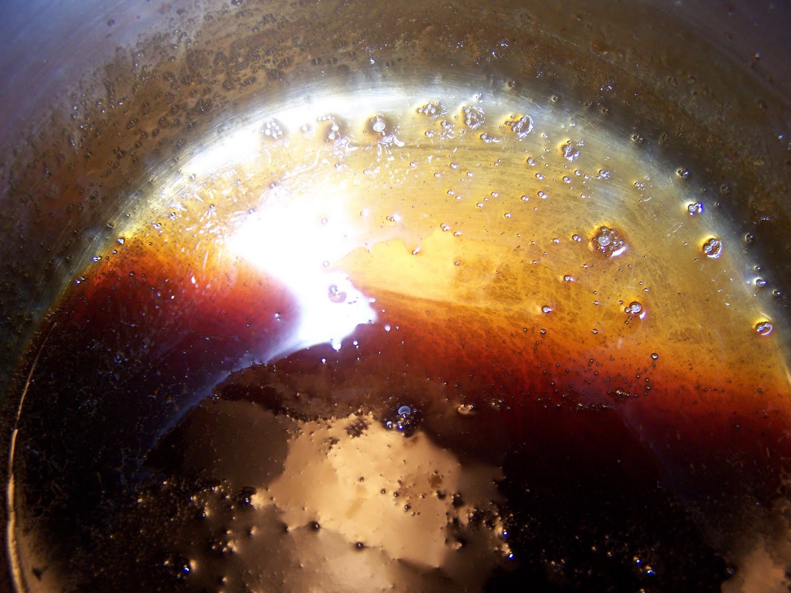Lower heat and let the syrup stand. Right now it should be chocolate/coffee colored, but it will start bubbling and turn a beautiful, deep copper color.